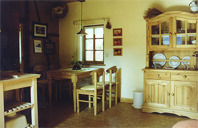 Im Obergeschoß des Torgebäudes, das als Holzwerkstatt, Sielekammer, Taubenschlag und Materiallager genutzt wurde, haben wir eine Ferienwohnung mit insgesamt drei Zimmern und vier bis acht Betten ausgebaut. Zusätzlich kann ein Bettchen für´s Baby oder kleinere Kinder aufgestellt werden. Auch an ein romantisches Hochzeitzimmer haben wir gedacht. Schöne Textilien und geschmackvolle Dekorationen sorgen für Gemütlichkeit. Rustikale Holzmöbel, Lehmwände, Balkendecken und der bretterverschlagene Aufgang über die alte Holzsteige vermitteln einen Eindruck vom ursprünglichen Aussehen des Gebäudes.